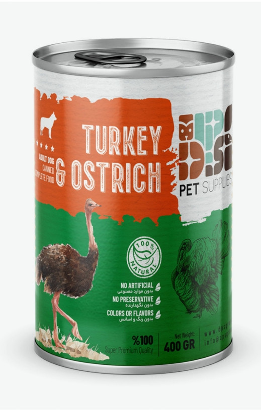 کنسرو 400 گرمی نچرال گوشت شتر مرغ و بوقلمون مخصوص سگ DPS