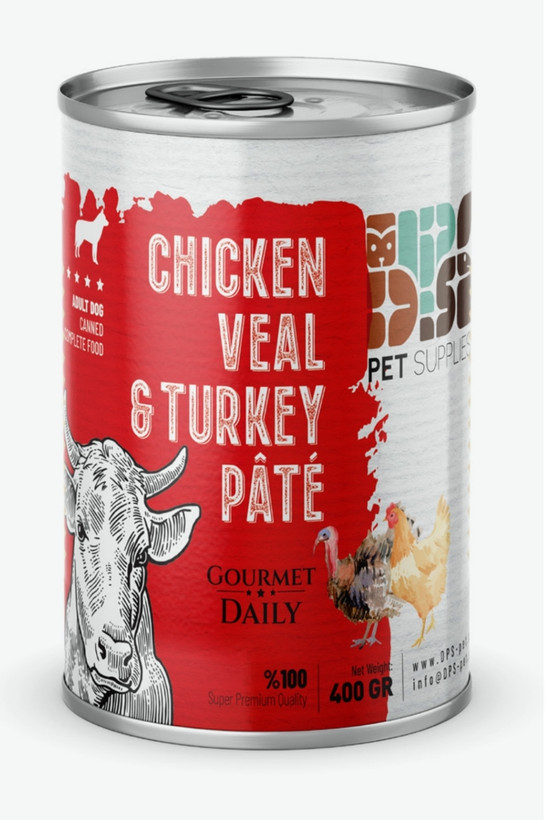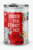 🍗🥩🦃 کنسرو پته مرغ، گوساله و بوقلمون ۴۰۰ گرمی – وعدهای کامل و خوشطعم برای سگ بالغ
