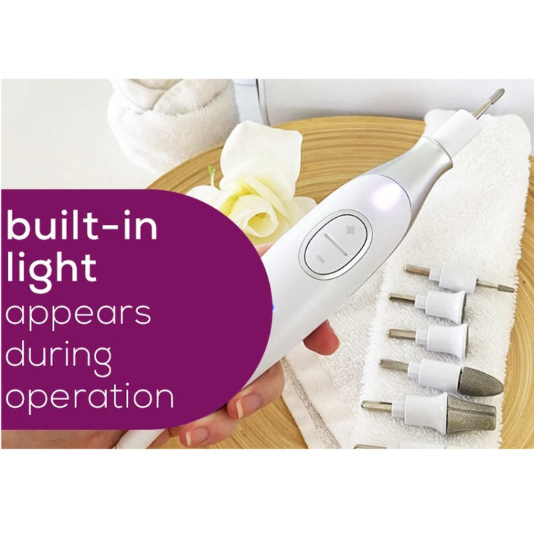 ابزار کامل مراقبت از ناخنها شامل سوهان برقی، چوبهای مانیکور و فرچههای تمیزکننده